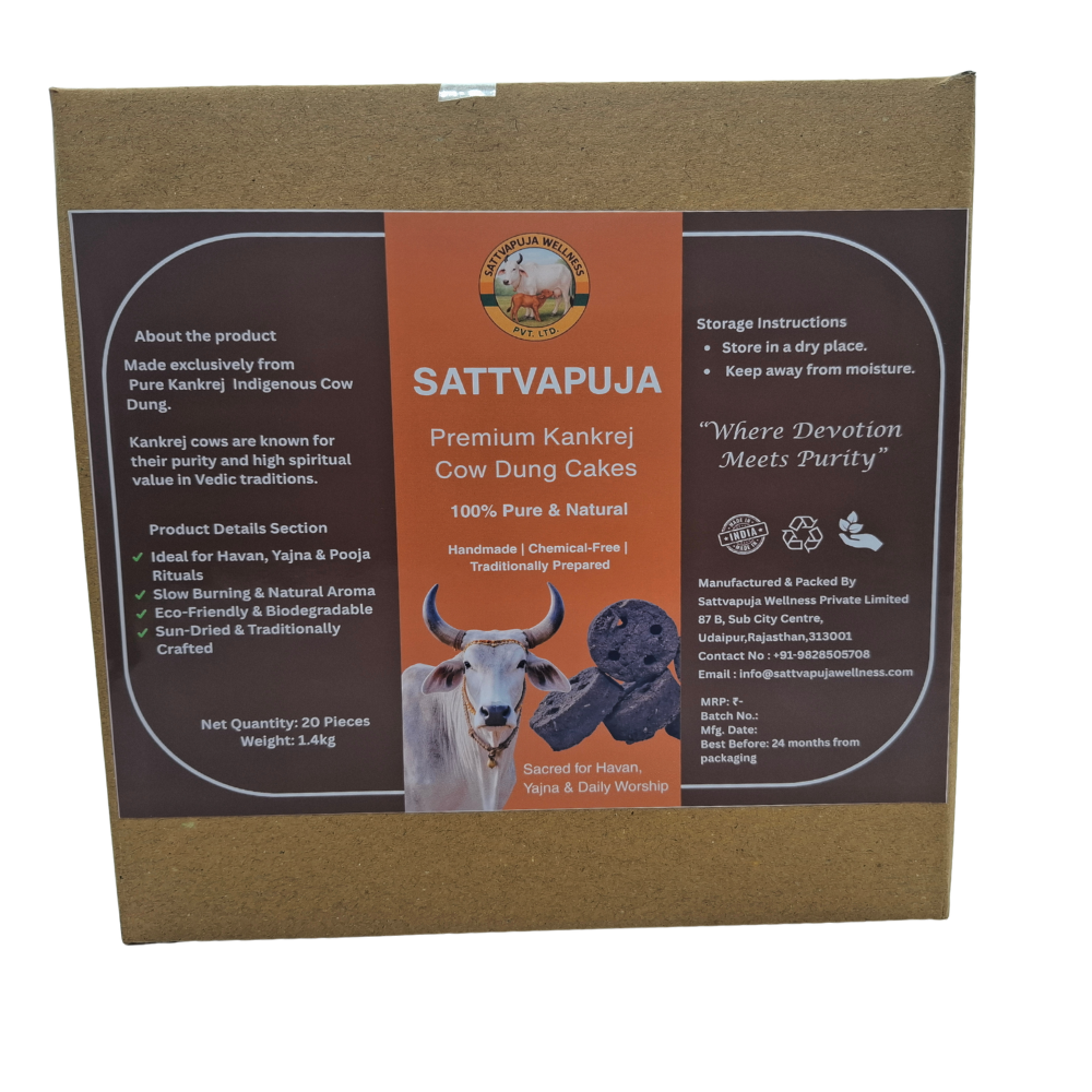 Sattvapuja Wellness Cow Dung Cake 20 Pieces pack is prepared using traditional methods and naturally sun-dried for spiritual and religious use. These cow dung cakes are widely used in havan, yajna, pooja ceremonies and festive rituals.